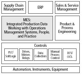 下圖是國際MES協會(hui) 所描繪的製造企業(ye) 信息係統體(ti) 係結構,MES起到了ERP/MRP-II和車間自動化係統間承上啟下的作用。